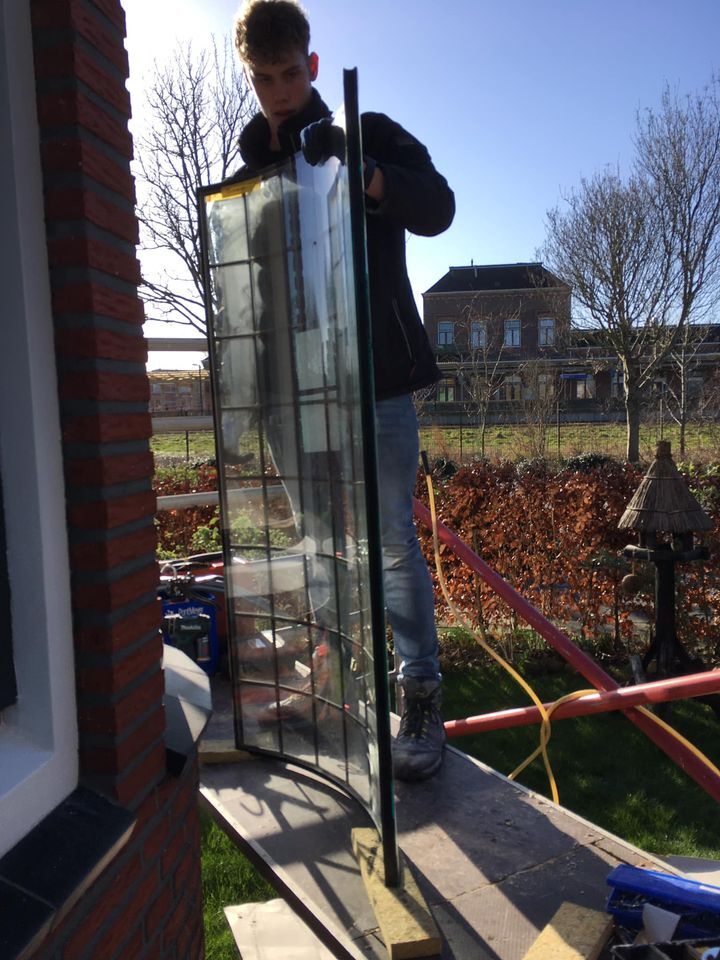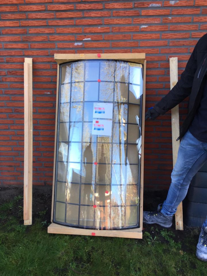 Vervangen van een gebogen glas in lood paneel in isolatieglas te Delfzijl. Hierbij ontstaat er 3-dubbel glas, met het glas in lood paneel in het midden. Voordelen zijn o.a gemak in onderhoud, isolatiewaarde, bescherming