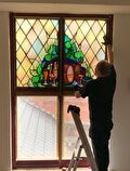Als de afbeelding compleet is, zetten wij de stukjes glas in het lood, zodat een gebrandschilderd glas-in-lood-raam ontstaat.